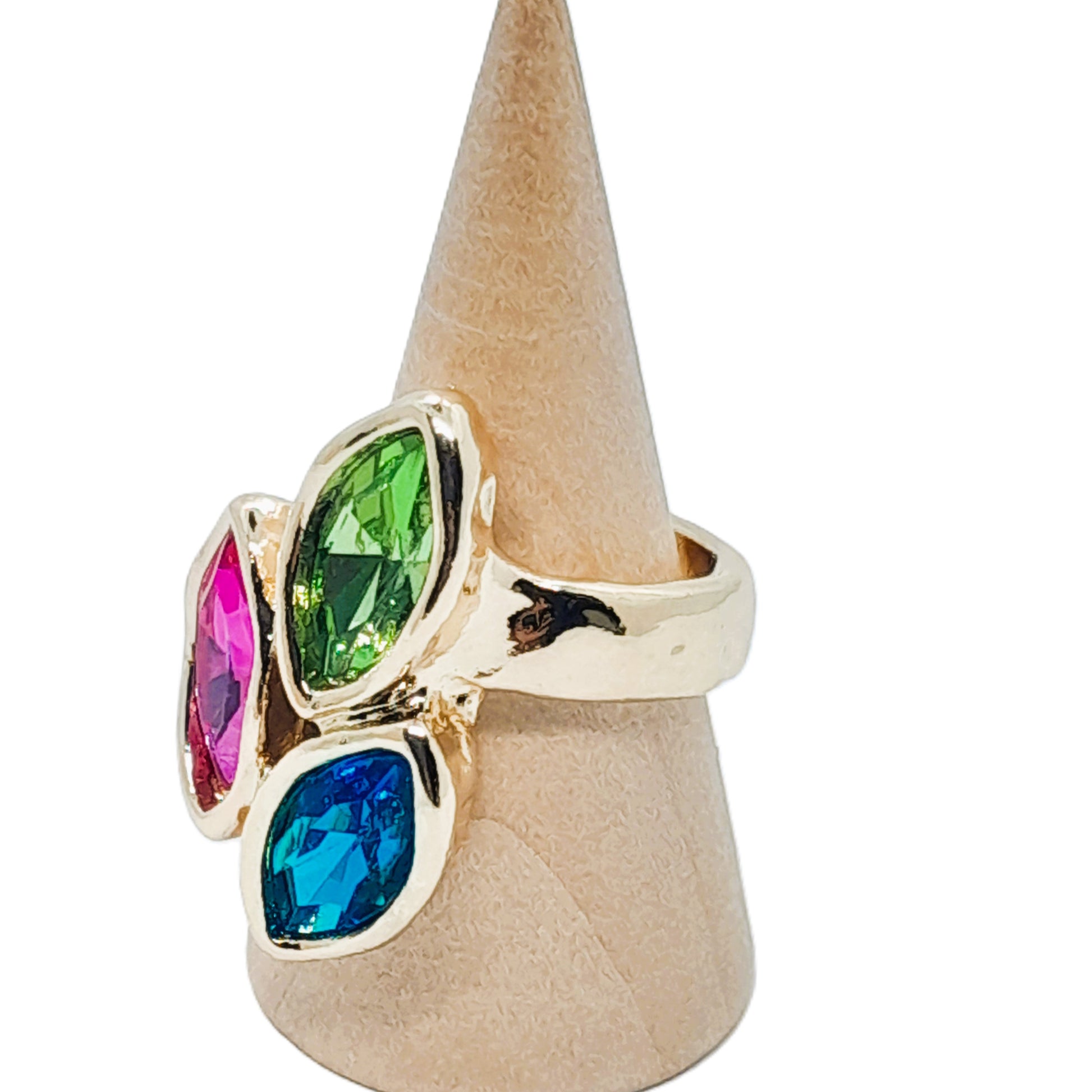 Anillo en tono oro y tres cristales brillante de hermosos colores. Disponible en talla 7.