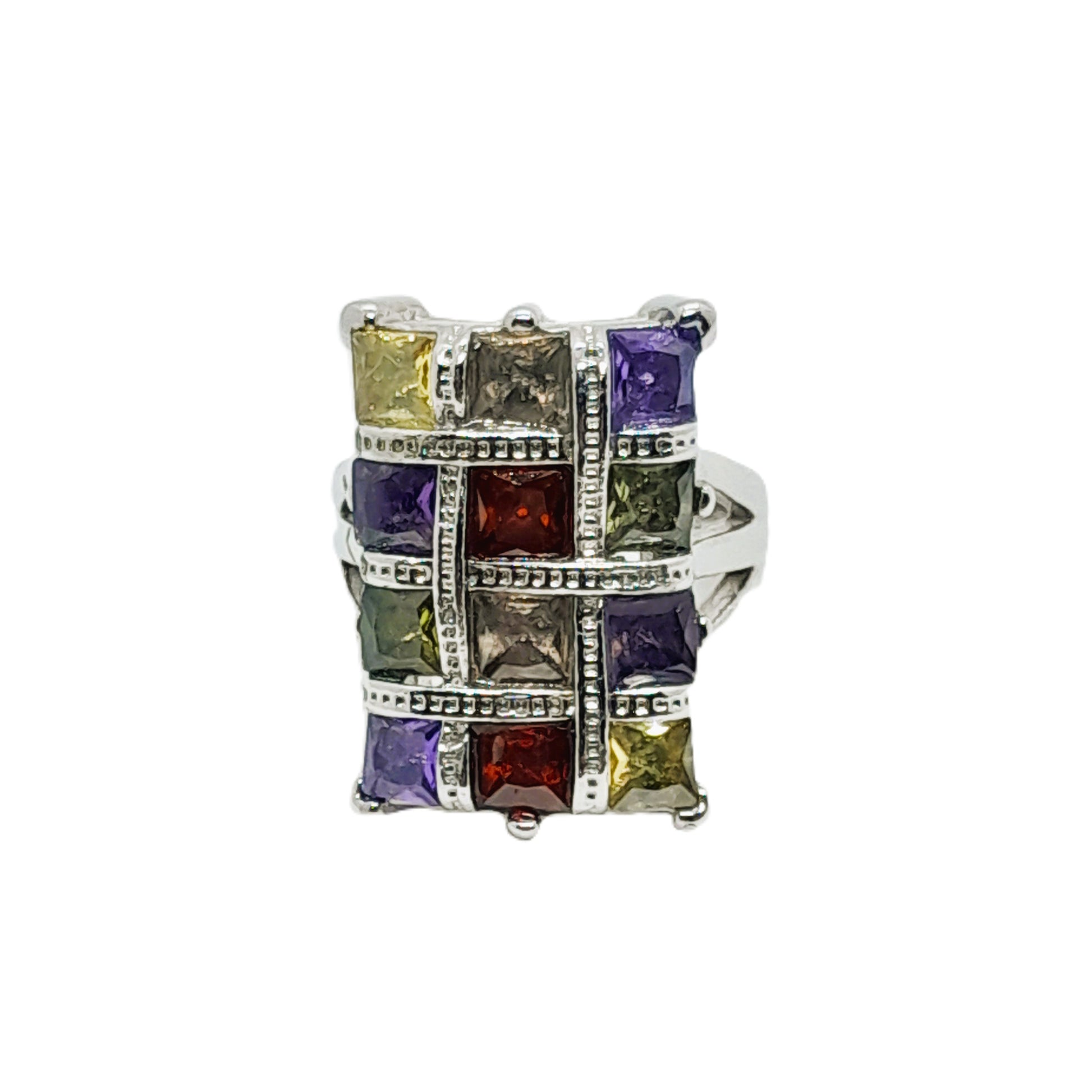 Este hermoso anillo cuenta con un baño de rodio y brillantes circonitas cúbicas multicolores. Agrega un toque de color a cualquier atuendo con esta llamativa pieza.