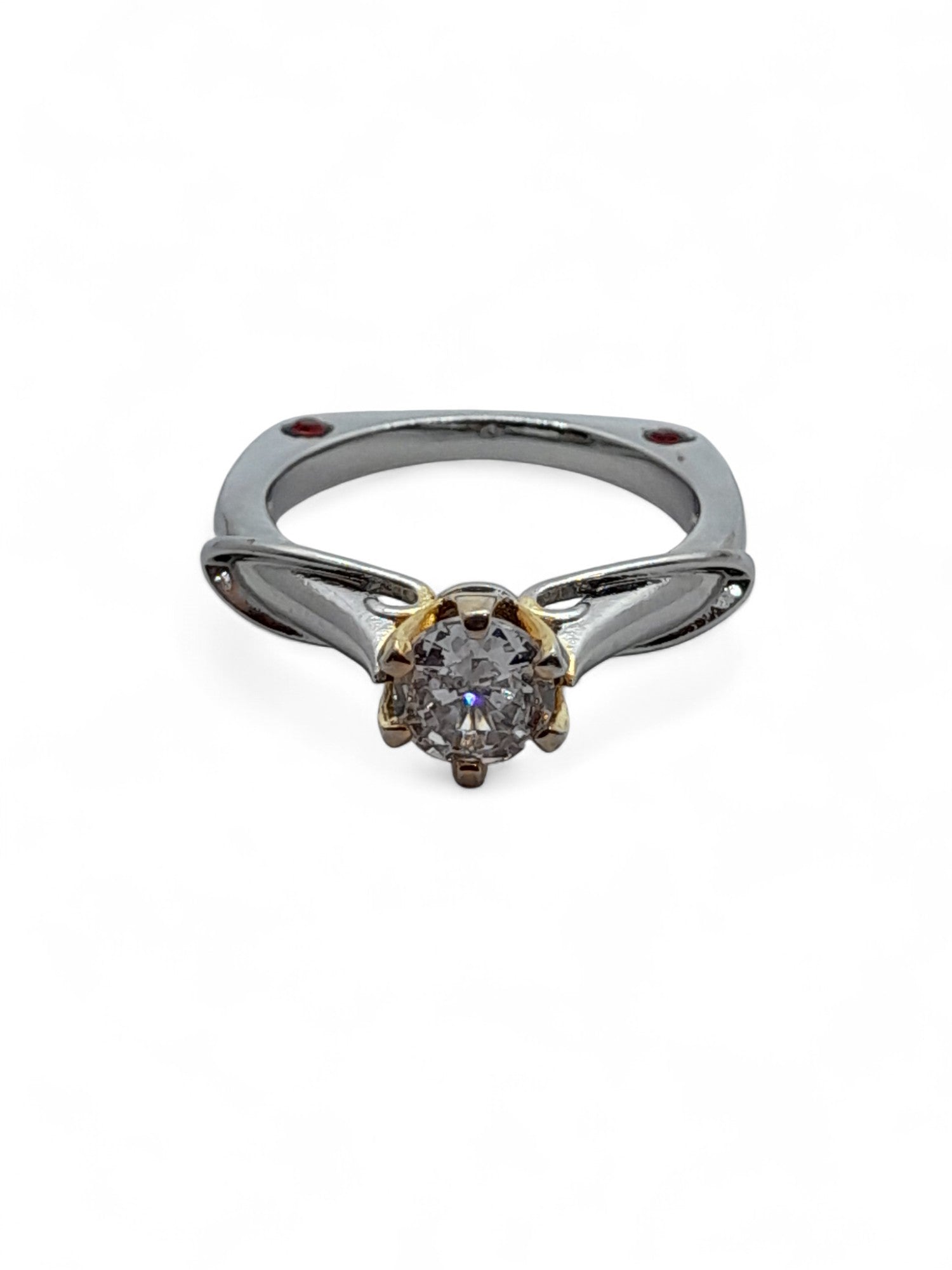 Bello anillo solitario con circonita blanca y detalles en rojas. Es un accesorio imprescindible para cualquier amante de las joyas. Su combinación perfecta de brillo y elegancia realzará cualquier atuendo. Disponible en talla 7.