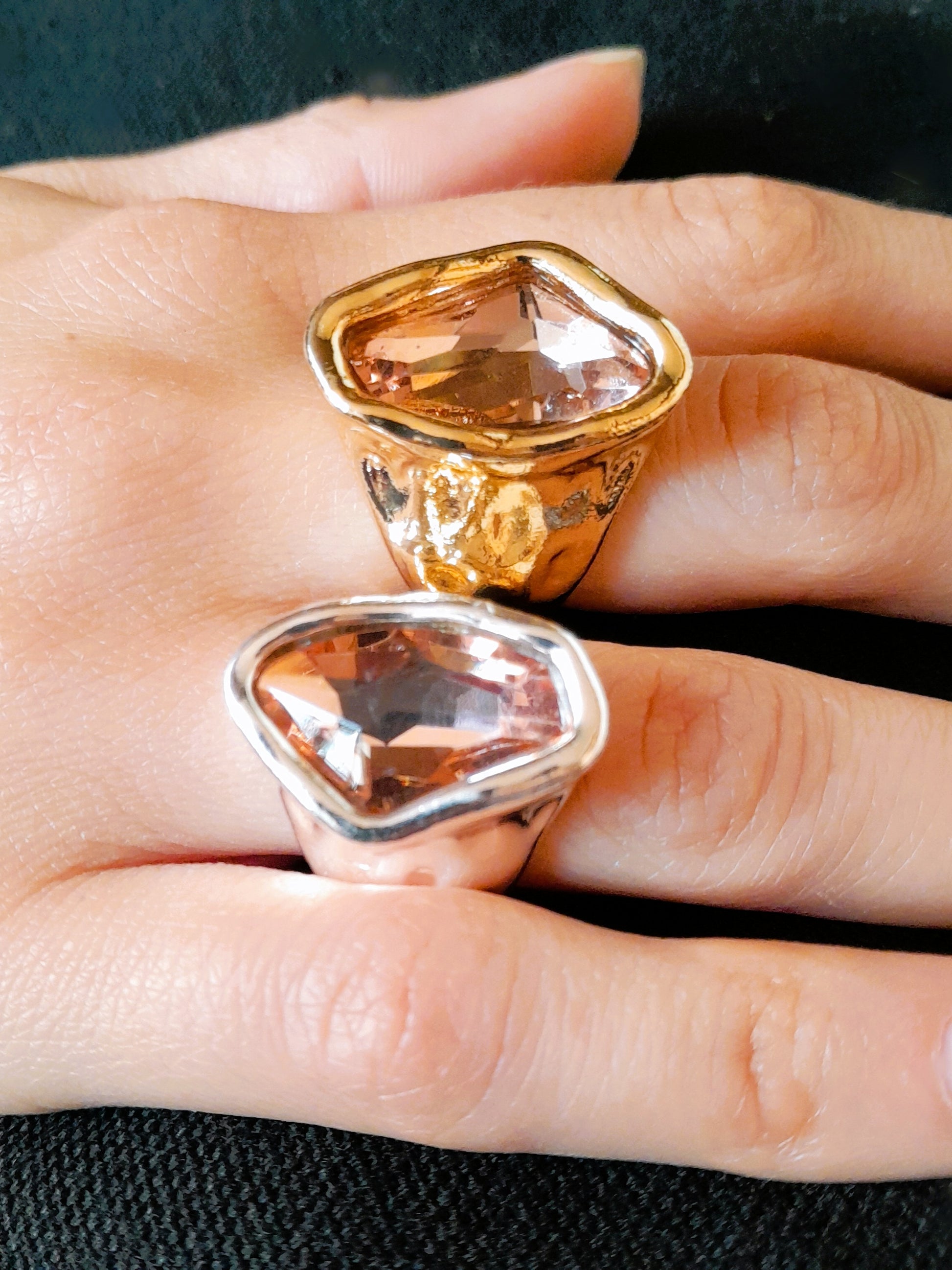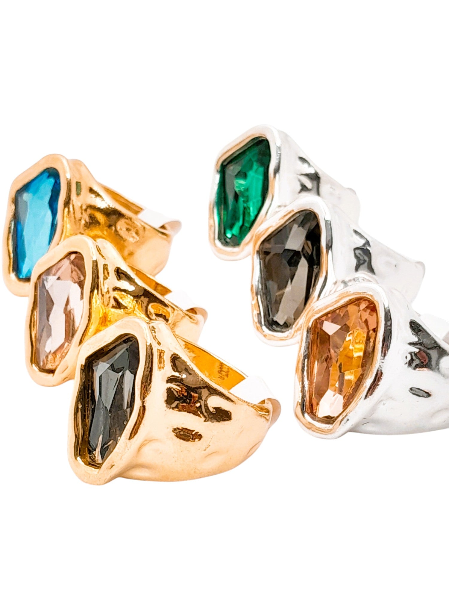 Experimenta el poder y la belleza de nuestro Anillo VALKIRIA. Este anillo asimétrico en dorados y plateados está adornado con el cristal de tu elección.