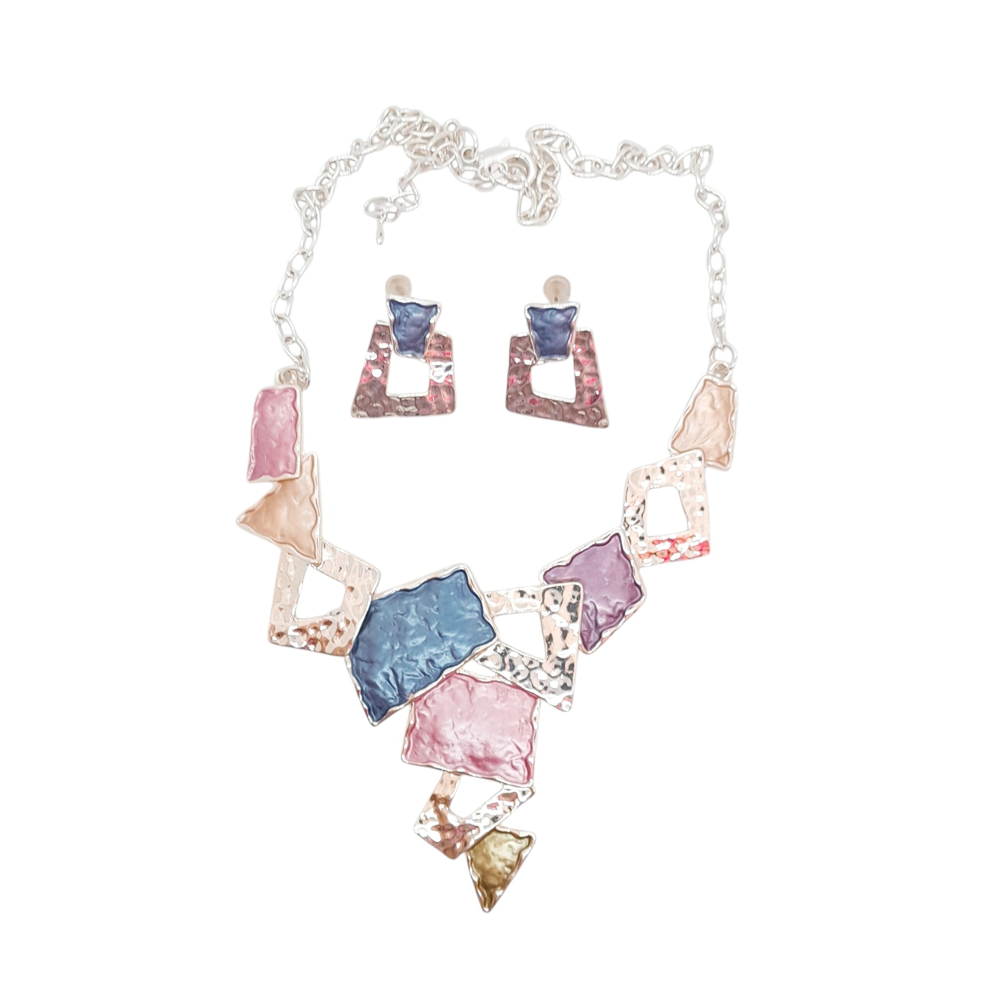 Transforma tu look con este impresionante conjunto de collar y aros de plateados. El diseño intrincado con detalles de esmaltados en tono pastel agrega elegancia y un toque divertido a cualquier atuendo.
