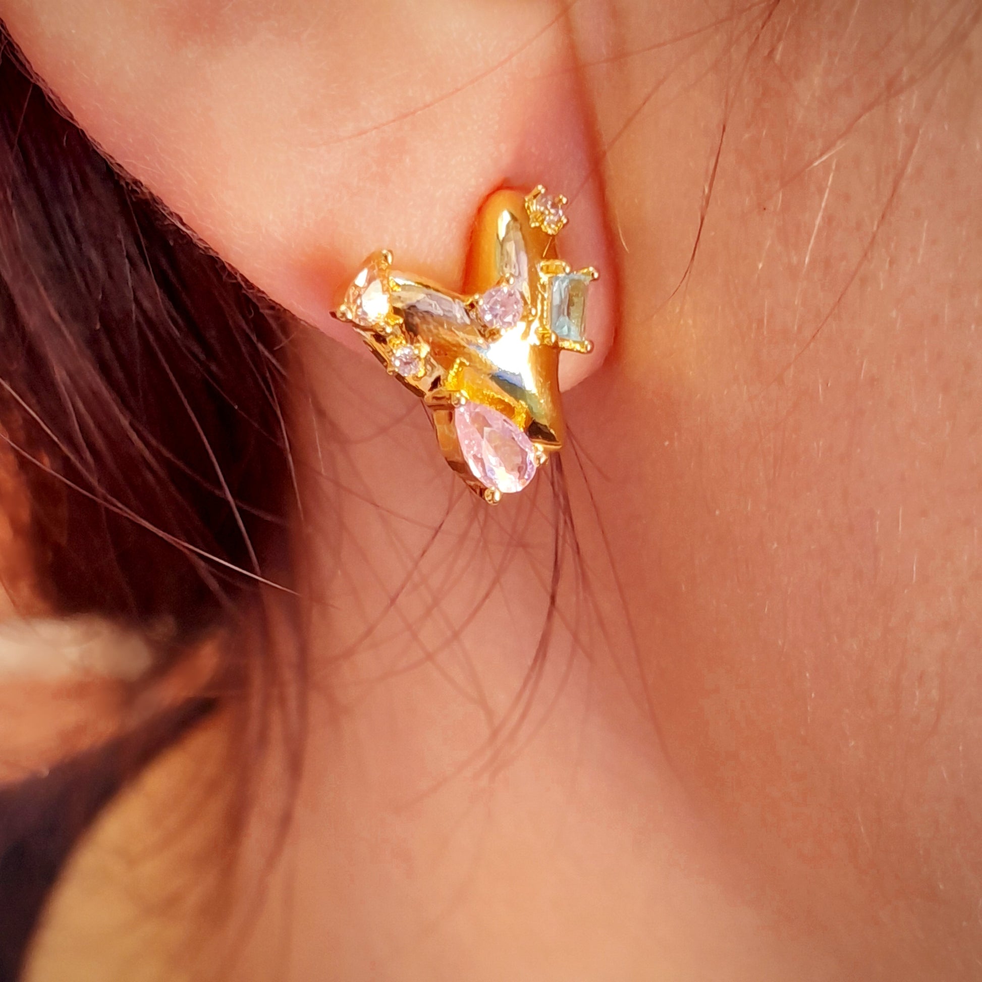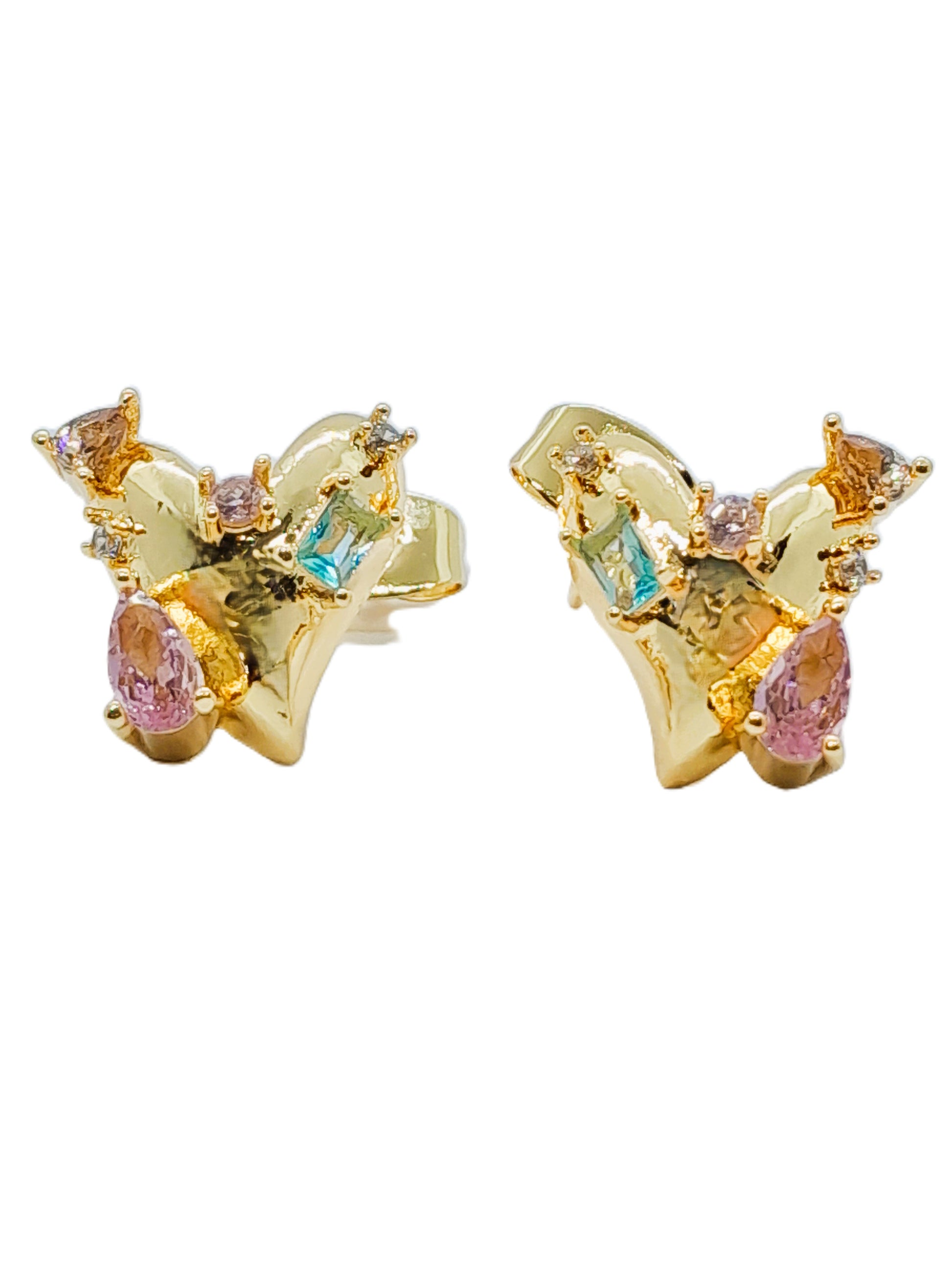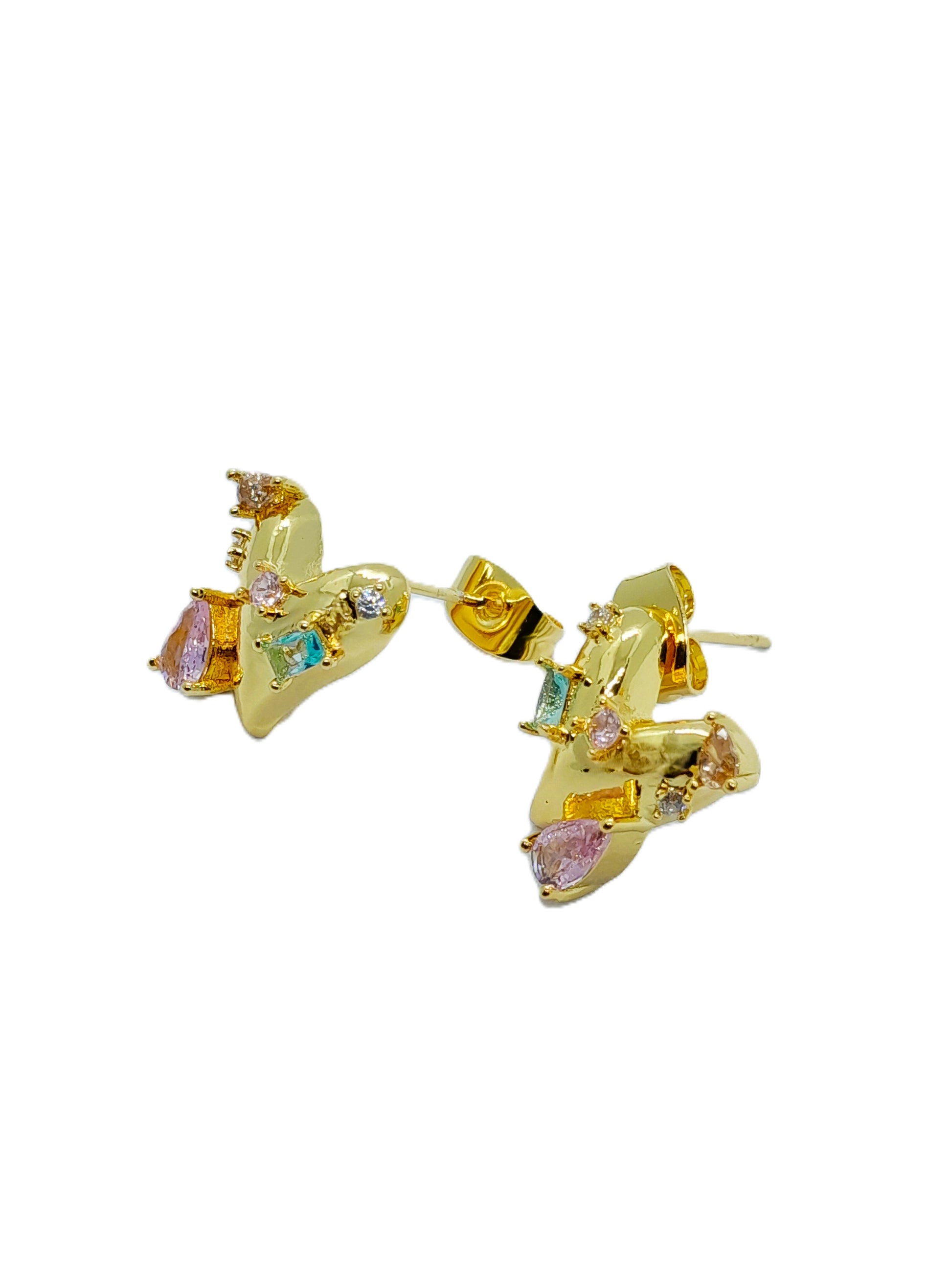 Estos aros dorados presentan un diseño único de corazón parchado adornado con circones de colores vibrantes. Su brillo cálido combinado con los destellos multicolor realza cualquier look, aportando un toque de elegancia y personalidad.