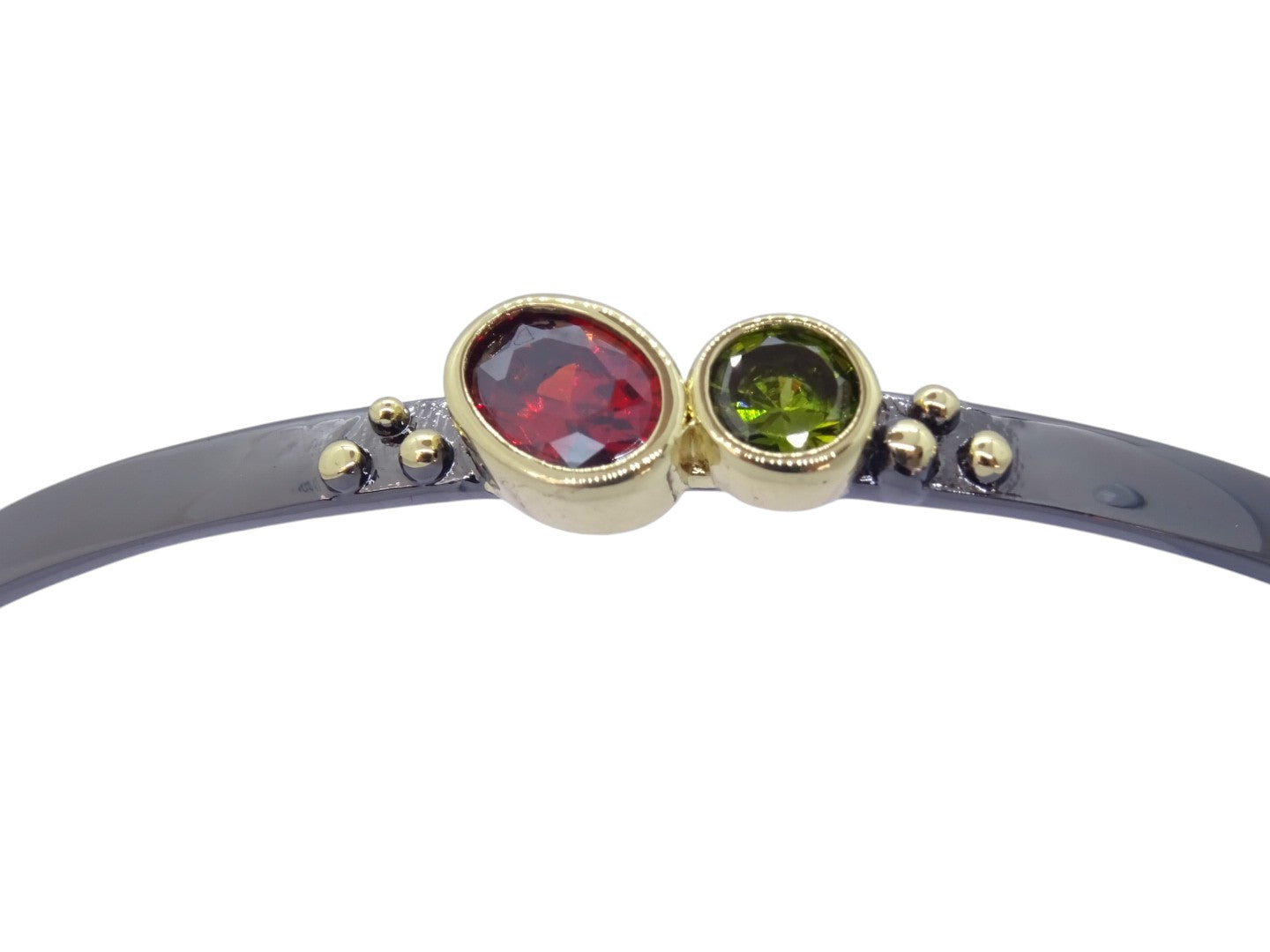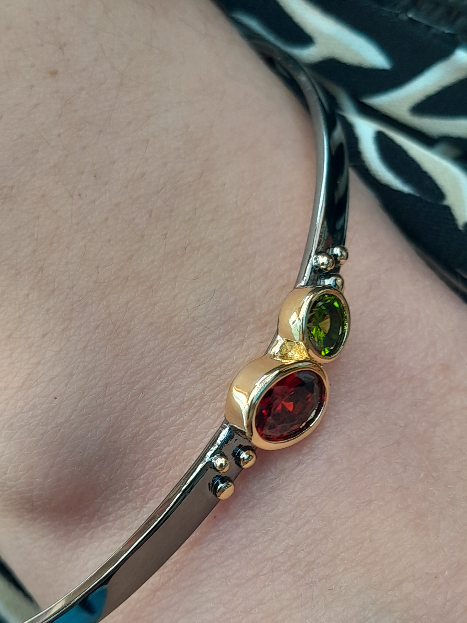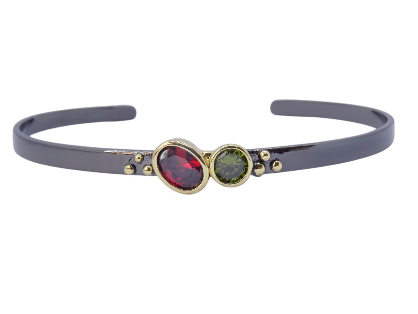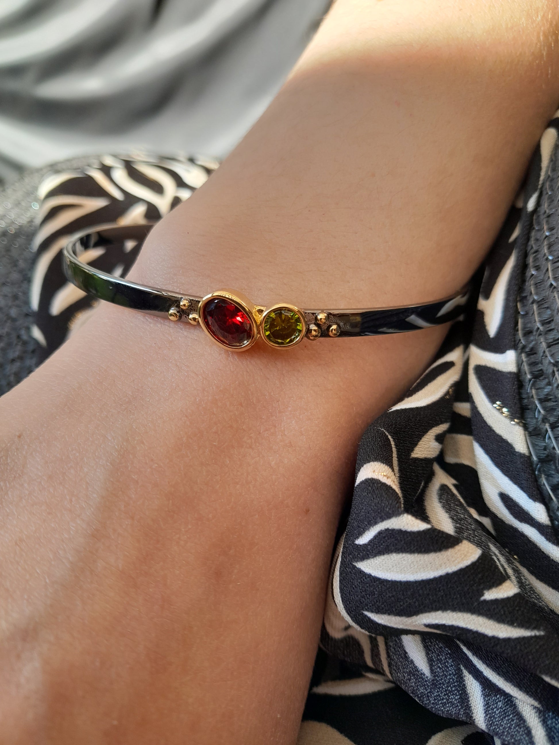 Pulsera de tungsteno y plata con piedras de colores vibrantes y detalles en oro para darle un toque lujoso.