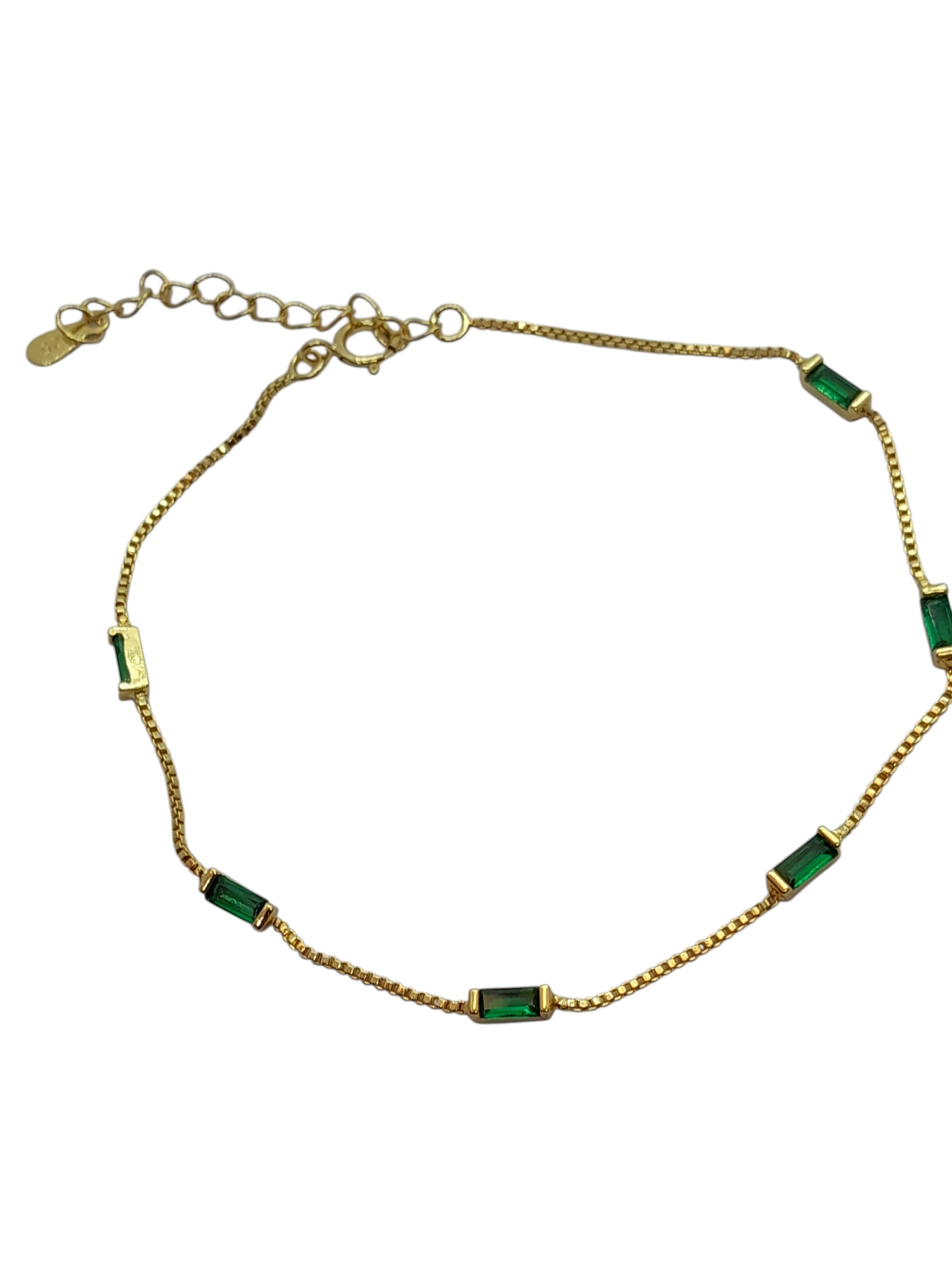 Elaborada con sencillez y delicadeza, esta pulsera es el accesorio perfecto para realzar tu estilo. El baño de oro y las esmeraldinas brillantes hacen que cualquier muñeca destaque.