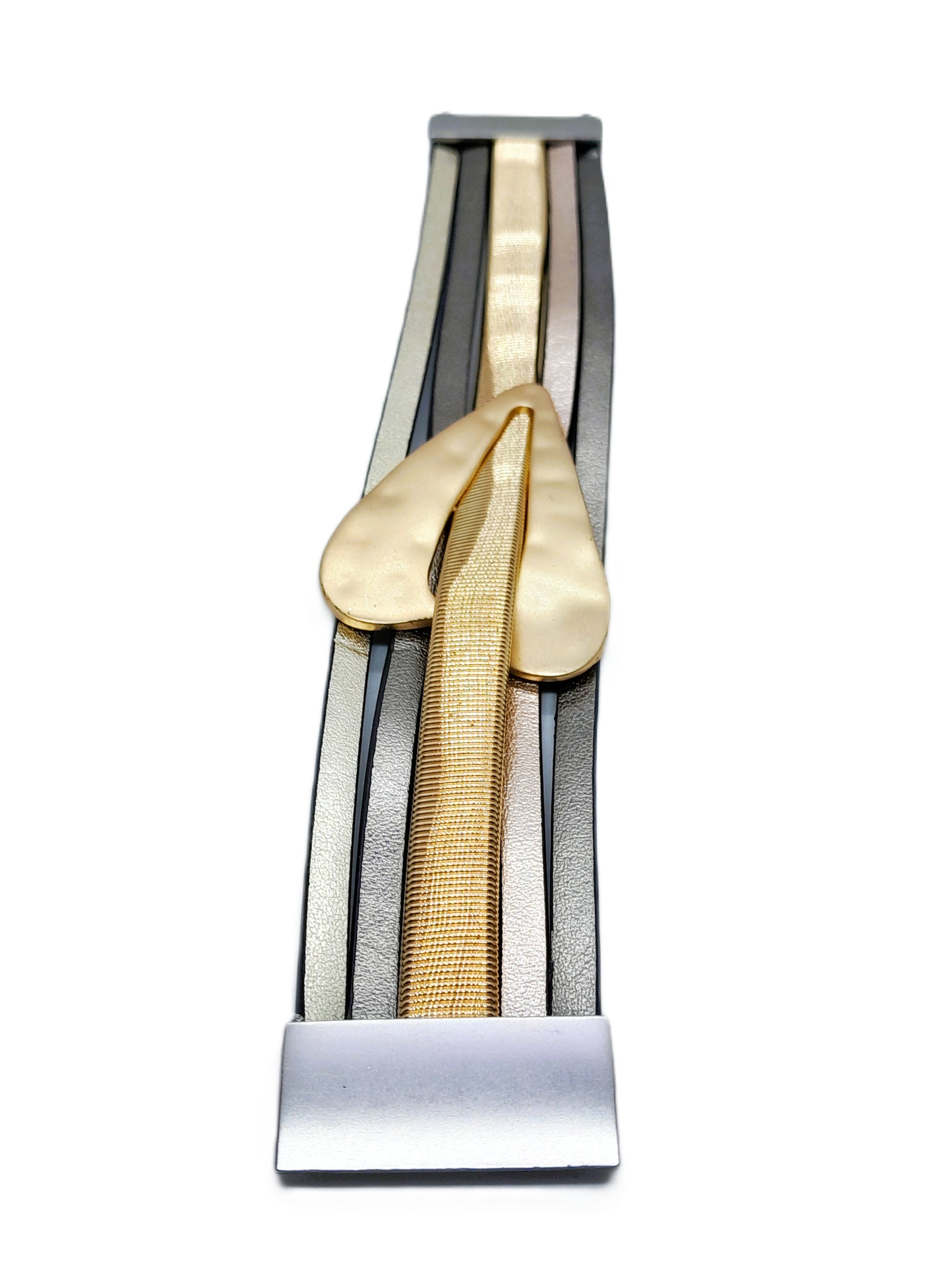 Fabricada en cuero ecológico de alta calidad color gris grafito, dorados y detalle en el centro, esta pulsera irradia estilo y encanto. Los intrincados detalles añaden un toque de singularidad a tu atuendo, lo que la convierte en un accesorio imprescindible para cualquier entusiasta del estilo hippie chic.
